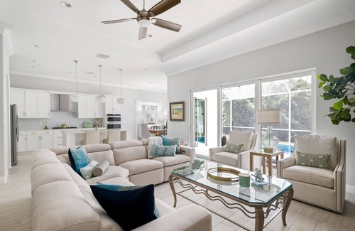 LIVING ROOM: This living room is the perfect spot to unwind after a long day. Admire the view of the private pool and backyard while watching TV or lounging on the couch.