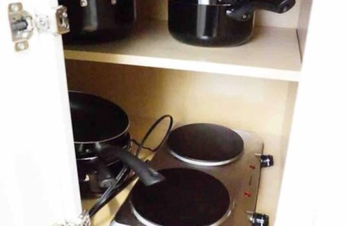 Private FIRST FLOOR 500 sq ft apartment with a fully stocked kitchen. There is a portable 2-burner cooktop, microwave, toaster oven, coffee maker, and all utensils and cookware needed for a great meal! Everything is new at this fully renovated apartment!