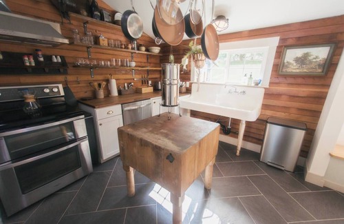 When you arrive, you immediately feel torn between two time-frames. The quaint little kitchen was carefully put back together with the original shiplap and a farm sink from the 1930s. An all original 1940s refrigerator (yes it still works!) and a vintage butcher-block island that sits atop a modern herringbone tile floor and paired with stainless steel appliances (dishwasher and stove).