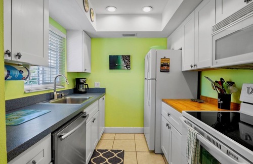 Step outside to your private patio oasis featuring a bistro table, BBQ grill, outdoor shower, and washer and dryer. Everything you need for a carefree beach vacation!