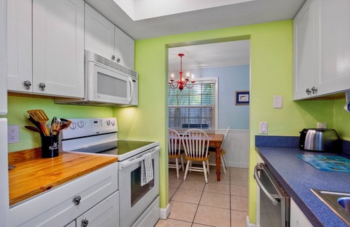 The living room offers cozy coastal furnishings, TV, and a vibrant tropical ambiance. Whether you're enjoying a movie night after the beach or planning your day’s adventures, this space sets the tone for true relaxation. The kitchen is fully equipped with modern appliances, cooking utensils, and a dining table for enjoying meals together with ease.