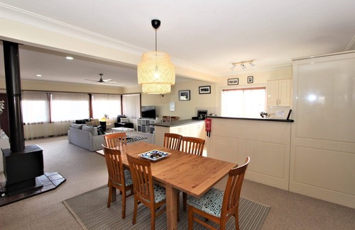 Beachview cottage offers spacious open-plan living with a wood fireplace