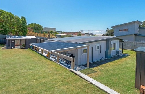 Cool little beach house in awesome location! Only a 5 min walk to the beach, estuary, kids park and bike track, and barely a 2 min walk to the local cafe. Two bedrooms, one with a queen sized bed, the other with a double bed, and a sleepout with two single beds. Modern bathroom and all new furniture. DVD library available for the rainy days and bodyboards for when you hit the beach. Two outdoor living areas with a BBQ, Pizza Oven and a great Spa Pool! Fully fenced section with secure off street parking.