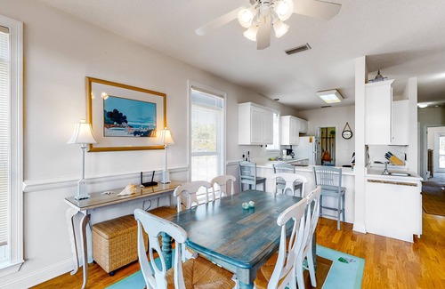 Relax in a comfortable home with plenty of beach-themed decor to get you in the vacation mood! Cook up meals for the beach inside the full kitchen, which includes a breakfast bar with room for two guests to enjoy a casual meal and a bonus wet-bar style sink. The entire interior is cooled with central air conditioning, but each bedroom features a ceiling fan so you can customize your own level of comfort while settling in. Just rinse off in the outdoor shower, set the clothes to go in the private washer/dryer, and enjoy the distant ocean view out on the porch. It's time to relax.