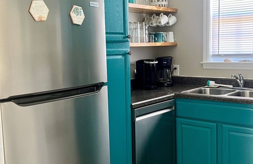 Fully Equipped kitchen, new 2023 refrigerator, microwave, new 2023 dishwasher electric stove, dishes, silverware, Keurig and coffee maker, glasses, baking dishes, crockpot, griddle and cooking utensils.