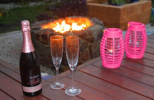 3 bedrooms, 2 bathrooms, open living area and kitchen, polished floorboards, large entertaining deck, large fire pit, day bed, hydrotherapy spa and various seating areas.