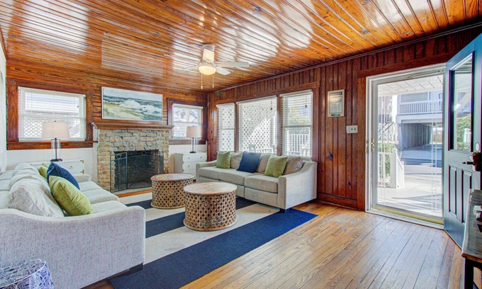 Beacon House in Carolina Beach is a spacious and inviting beach getaway, just one row back from the ocean, with easy access to sand and surf. This charming retreat offers parking for up to three vehicles and features two large decks, where guests can relax in rocking chairs and soak in the coastal breeze. The upper deck even includes a ceiling fan for added comfort on warm days, creating the perfect spot to unwind and enjoy Carolina Beach's natural beauty.