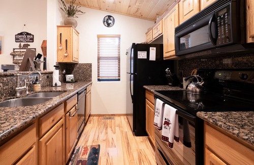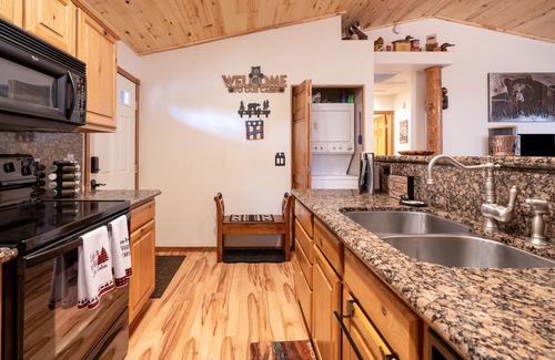 Experience the charm of mountain-themed decor complemented by contemporary comforts. The open living area serves as a central hub, featuring a 65” HDTV for entertainment, and a cozy gas fireplace that promises warmth. Culinary enthusiasts will appreciate the fully equipped kitchen, complete with a Keurig coffee maker, electric stove, and a suite of cooking essentials, making meal preparation a breeze.