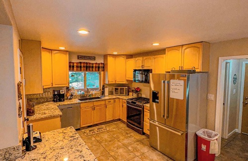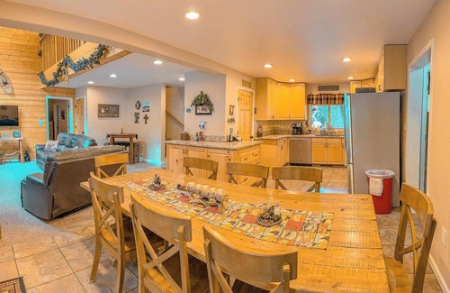 This rustic, spacious 4 bd, 3.5 ba cabin in Sierra Cedars is located on a quiet cul-de-sac. The lake is located around 3 miles away, so you’ll have many water activities to choose from in the summer. If you’re staying in winter, China Peak is 22 miles away. This cabin has a large front & back deck with a beautiful view of the pines. You’ll walk inside to the living area with a wood stove and beautiful kitchen area. Walk upstairs to the large game room which includes many arcade style games.