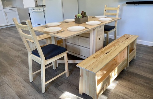 The kitchen is fully stocked for your culinary needs with a gas stove/oven, microwave, dishwasher, Keurig coffee machine and French press. There is an intimate dining option but the table can expand to fit a larger family. Additional dining is available on the deck as you relax in the privacy of your own backyard. Fire-up some locally raised grass-fed meat that you pick up at the Farmer’s Market or the local butcher on the propane grill provided.