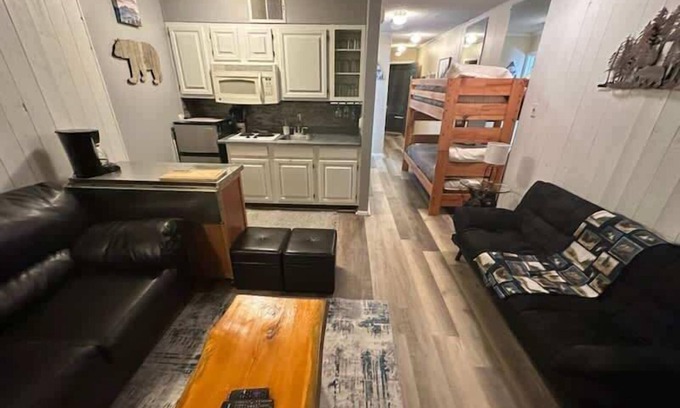 Canyon Creek Condo #129 - A very nice one bedroom condo unit on the ground level. Has a Queen size bed for the adults in the bed room and 2 built in bunk beds for the kids. Living room with a sofa sleeper and futon. Includes kitchenette and fireplace with a private patio view of the creek on property with gate access. Ground level with bunks for kids, plus a sofa sleeper.