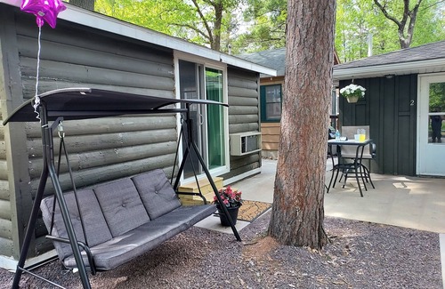 Step into Bear Cottage, a quaint retreat where simplicity meets the warmth of northwoods character. Within its snug interiors, the full-sized bed sits adjacent to the main living area, offering an intimate space for rest and relaxation. Bathed in natural light from the side patio door, the cottage whispers hints of the nearby lake, set amidst the lush backdrop of Wisconsin's timeless woodlands.