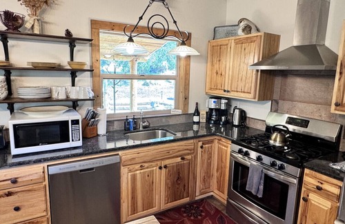 When you walk into the Bear Creek Cabin, you won't find the musty stuffiness, typical of many vacation rentals. It is fresh and clean with a pleasing blend of new vintage and contemporary furnishings. The modern kitchen is fully stocked with pots, pans, bakeware and an array of spices. There are 3 flat screen smart TV's, FAST free Wi-Fi.