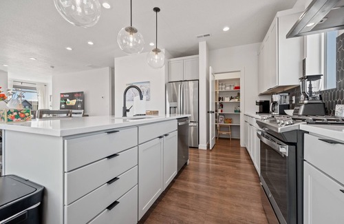 Inside, natural light fills the home and highlights breathtaking mountain views. The open-concept living area features plush seating and a state-of-the-art 77" Smart TV, creating a warm and inviting space for relaxing or entertaining. The dining area comfortably seats eight, with room for four more at the large kitchen island. The kitchen is a chef’s dream, fully equipped with high-end stainless steel appliances, a gas stove, spacious quartz island, and a large refrigerator—everything you need to prepare delicious home-cooked meals.