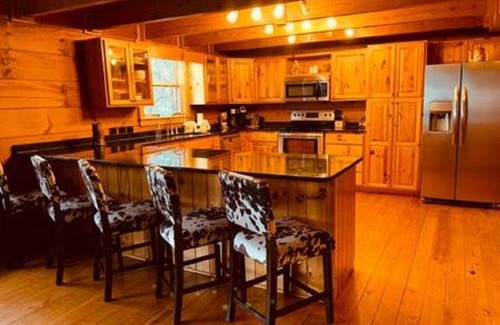 This 4,100 square foot cabin is designed for comfort and convenience, featuring two floor-to-ceiling rock fireplaces, a fully stocked kitchen with granite countertops, and ample seating to host your wedding feast. Guests can gather in the expansive dining area or enjoy drinks at the granite bar before retreating to the oversized deck for stunning sunset views. The property also features a relaxing six-person hot tub equipped with Bluetooth speakers, offering the perfect spot for post-wedding relaxation. Enjoy evenings around the fire pit or unwind on the covered front porch while soaking in the serene mountain atmosphere.