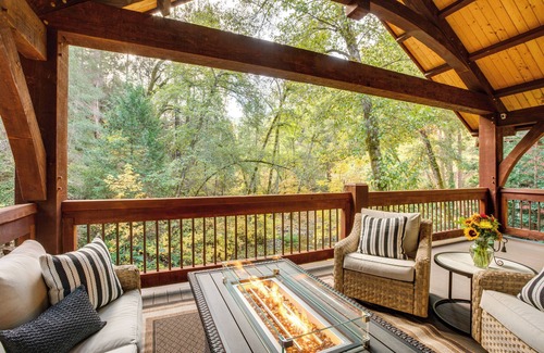 Hot Tub in Eyeshot of TV & Creek | Hand-Built Timber-Frame Home