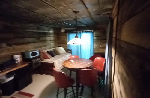 Weused unfinished lumber for the walls in the main living area. French doors, sinks, lighting and other little things came from habitat restore. The kitchenette is perfect size! The small oven is air fryer, toaster, bakes, and broils. Big enough for a pizza. There is a dining area inside but also 1 right outside French doors. There is another rental in the front. It is listed on here also. Plus you can rent them together (sleeps 10)There are some shared outdoor spots.encluding , and see some setting areas, no worries there are plenty of places to get privacy.