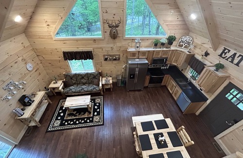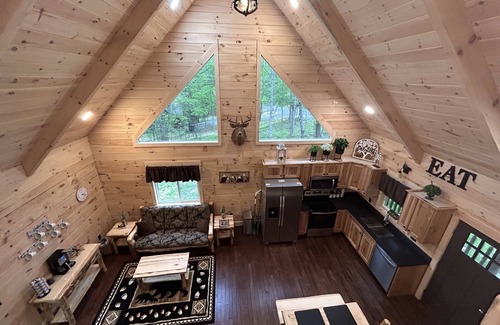 This gorgeous 2 bedroom 1 bathroom cabin has a full kitchen and living area with a fireplace. The gorgeous half loft has a futon that makes into a full size bed.