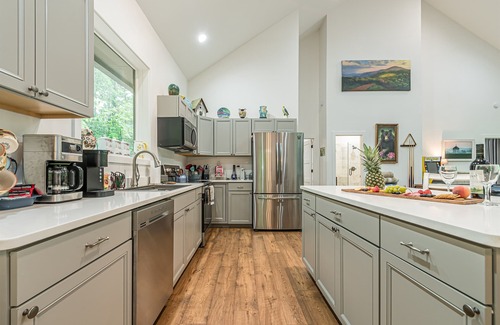 This exquisite property boasts a range of amenities to ensure your stay is both comfortable and enjoyable. Relax in the hot tub under the stars, gather around the stone fire pit for s'mores, or challenge your friends to a game on the 9' slate pool table. The spacious kitchen features modern appliances for cooking delicious meals, while both bedrooms offer luxurious King-size PURPLE HYBRID mattresses for a restful night’s sleep. Enjoy morning coffee on the expansive deck, where you can take in the seasonal mountain views and admire the local wildlife. Every detail has been thoughtfully designed to cater to your needs, ensuring a stress-free experience leading up to your big day.