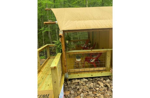 Amazing views off the cozy porch as you enter the front of Glamping Tent you see a Kitchen table to your Right and Kitchenette with Coffee Bar and Mini Fridge. There is a Full working bathroom with shower, sink and Toilet. Queen Bed with Lovely Bedding to make you at Home. Has a/c & Heat for your comfort as well
