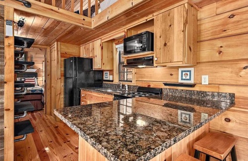 This quaint Cabin is nestled in a beautiful well maintained gated RV community. This is one bedroom with king bed one bathroom with a loft ( queen) for extra sleeping space. Enjoy beautiful views while walking, biking or riding a golf cart. Cabin is dog friendly. Enjoy nearby sites, waterfalls and hiking. This is the perfect place for a mountain getaway. Cabin is very cozy with everything needed for a comfortable stay. Large deck with plenty of outdoor space to enjoy the outdoors.