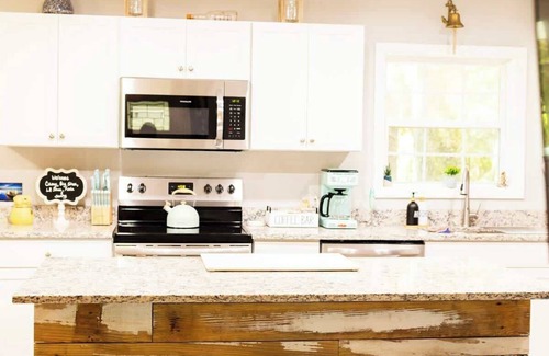 -The Fully Stocked Kitchen provides Stainless Steel Appliances along with basic cooking Utensils (blender, mini food chopper, & electric griddle) an ample amount of space for cooking meals and preparing any meal . Also provided are a coffee pot, ground coffee, creamers & sugar. In addition, a Keurig coffee maker, k-cups, creamers & sugar. The newly renovated Kitchen opens to 4 Chair Kitchen Dining Table plus Island seating for 3. You’ll admire the dimmable recessed lighting!