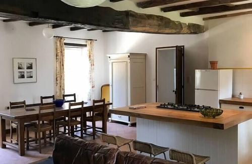 "Beaulieu Grand" offers rustic charm for up to 7 people. 6 people can sleep in the 3 bedrooms, and in case there is need for an extra bed, there's a single pull-out bed in the room that connects one bedroom and one bathroom. The accommodation has its own courtyard, which is entered through a beautiful portal from the 18th century. The view of the landscape is beautiful. The terrace was fitted with large natural sandstone slabs from a local quarry in 2024. There is also a large covered terrace with a dining table.
