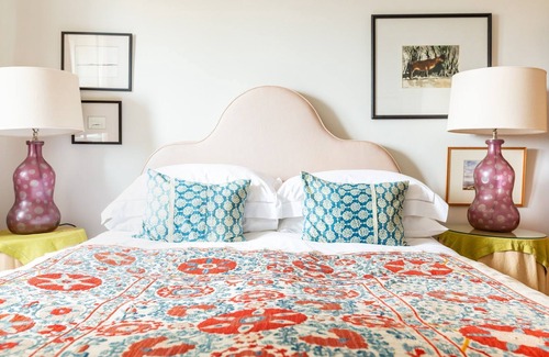 There is gallery-style art on the walls, an impressive sound system, statement lighting (check out Julian's 'Bacco' chandeliers) and antiques mixed with modern designer pieces. The accommodation feels deeply comforting with chunky exposed beams, oak boards warmed by big rugs and soft, muted colour schemes. Guests can curl up on the massive and sumptuously squishy sofa and chairs, in front of the log burner in the sitting room, and sleep comes easily in bedrooms full of country charm with iron-frame beds, wool blankets and linenfold wardrobes.