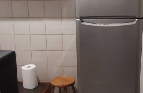 The kitchen has a fridge, a hob, an oven, a kettle, a freezer and a microwave.