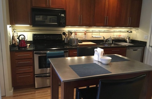 The kitchen has new granite counters, stainless appliances, and is furnished with all utensils and cookware, and small appliances such as toaster, blender, crock pot, instant pot, coffee maker and tea kettle. For dining, there is a counter height kitchen island from West Elm with a stainless counter top, that seats two people. In addition, there is a table with 4 chairs set up on the outdoor patio.