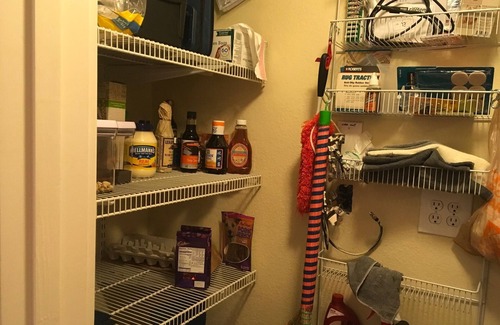 A walk in kitchen pantry is huge, with plenty of room for your food as well as an area to store cleaning products.