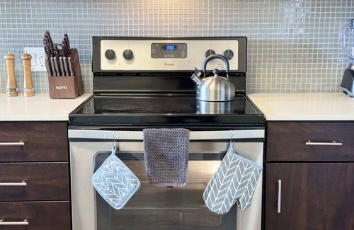 The kitchen is fully equipped with modern appliances, including a electric stove, oven, refrigerator, microwave, and coffee maker, as well as all the necessary cookware, utensils, and dishes. The dining area has a table with seating for four, perfect for enjoying a meal or playing a board game.
