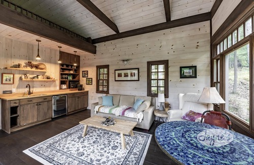 Guests staying "beyond the bridge" in the bunkie/guest house will find a Kitchenette with Thermador gas burner and grill, a Keurig coffee machine, microwave and toaster. Also found in this quaint living space is a cozy sitting area and two bedrooms with sleeping for 4.