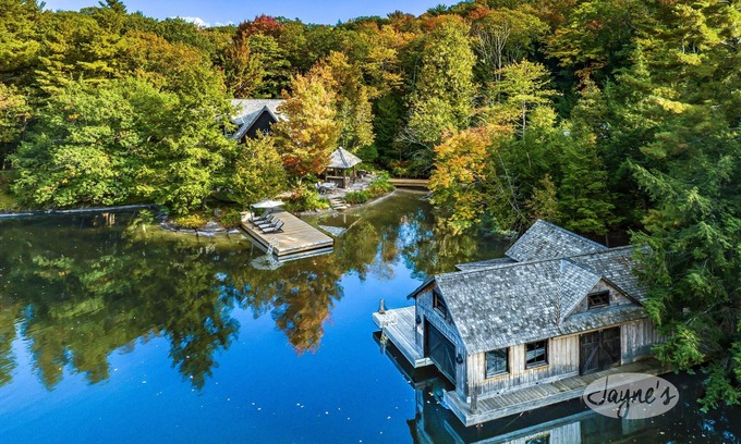 TIMBERLAND offers an abundance of privacy in quiet Dark Bay, perfect for a day on the water paddling or fishing! Flagstone steps and pathways adorn the property, creating a natural flow between sitting areas, and outdoor entertainment, on the waterfront. Lush gardens and just the right amount of coverage create a beautiful canopy, providing a little shade and excellent privacy. Sunbathers will find a home away from home just beyond the waters edge, on one of two dock areas. Four chaise loungers beneath an umbrella invite you to lounge in the sun! Connecting the cottage and boathouse, a walking bridge gives the property a feeling of being connected to land and water.