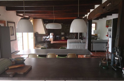 The two double rooms have a double bed that can be transformed into 2 single beds. The large children's room has 2 trundle beds and can comfortably accommodate 4 children (the house has extra mattresses if necessary) Fully equipped kitchen with a wood oven included. Wifi, international television channels, Hifi sound, home cinema with projector. Garden with apple trees, cherry, plum, blackberries, strawberries, raspberries and a small garden with lettuce, tomatoes, potatoes, zucchini, etc ... Children's games in the garden. Swings, zip line, hammocks, bicycles, scooters, etc. Many board games and toys. Thousands of books in French, English and Spanish, and a thousand CDs and vinyl of all kinds of music. Rio where you can bathe 100 meters, and beautiful walks through the forest.