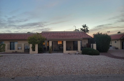 30 day booking only. Stay up to 30 days or less for a flat rate of $3500 plus cleaning fee of $120 plus VRBO fees book for 30 days and have the flexibility to travel and come back within the 30 day period. Your Casa Grande adventure begins at this charming 2-bedroom condo on Tierra Grande golf course. We are on the first fairway and the unit comes with a golfcart for 2, summer months cart not available due to battery care. This cozy space features 2 queen beds, 2 full bathrooms and essential amenities like Wi-Fi, a hair dryer, and a washer and dryer in unit. Our adorable place will help you feel at home while you're traveling in Arizona. The sunset from the large patio is tranquil and superb. This is on the newly owned Tierra Granda 18-hole golf course along with Strokers Bar and grill which has a simple and delicious menu along with cold drinks before or after the game. Great "base camp" for exploring Arizona.