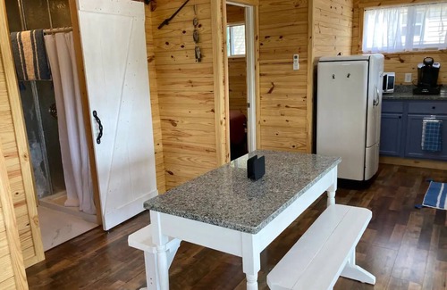 The cabin sits up on a hill with the driveway off Gilmore Road. Walkway with stones leads to the front porch. This cabin is not handicap accessible. Upon entering, the entire inside has been completely renovated. The open concept living space consists of kitchen, dining area and living room. Two bedrooms each with a queen bed. We also rent the house next store, so this is a great option for a larger family or multiple families to stay close together, but have their own space. The house next store sleeps 4-6. Contact me for more information.