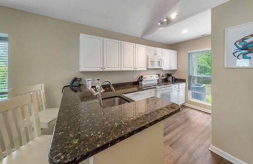 The kitchen has granite counter-tops, a stove, full sized refrigerator, microwave, coffee maker and a starter pack of coffee, dish soap and dishwasher tabs. There is a washer/dryer in the condo.