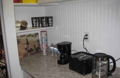 The first bedroom features a little kitchenette with a small refrigerator and is complete with all electrical appliances you need to feel comfortable such as a teapot, coffeemaker, toaster, and microwave.