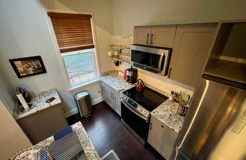 The property was designed to anticipate your every need, with high-end finishes throughout. The open concept kitchen is fully equipped with brand new appliances and a bar integrated with a spiral staircase that leads to the loft and upstairs bedroom. The unit comes equipped with a brand new appliances, Roku-enabled televisions, and high speed wifi in every room. The primary bedroom on the main level is furnished with a queen bed, dresser, and vintage chaise. The adjacent master bath includes a waterfall rainhead shower and imported Italian tile. There is also a half bath on the main level. The loft area features a large screen television and couch, and the second bedroom includes 2 twins and 1 full size bed. The courtyard outside features a professionally landscaped garden with mature dogwood trees, and provides a quiet respite in the heart of the city.