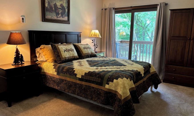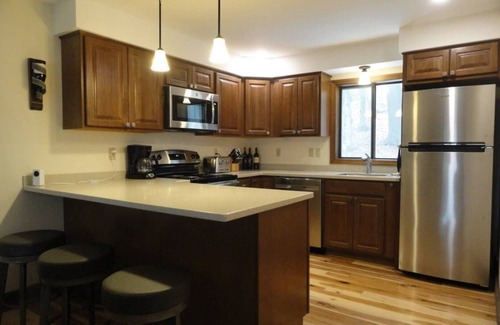This fully renovated, 2-BR end unit has it all, including 2.5 baths and private laundry for maximum comfort and guest accommodation. Gorgeous cherry kitchen, natural hickory flooring, newer carpeting, spacious patio, and so much more. Beautiful furnishings and amenities. Set in one of the most private buildings, this unit accommodates 4 comfortably, with the "long twins" converting easily into a king bed if preferred. Come, kick back, and relax in this rustically beautiful unit! Renters can purchase passes to the Quechee Club, for pool, lake and fitness club access, and can also gain access to the golf courses. Inquire for prices. Great deal with NO cleaning fee and NO host fee! NOTE: 4 DAY MINIMUM. No smoking/vaping in or around the unit. No pets.