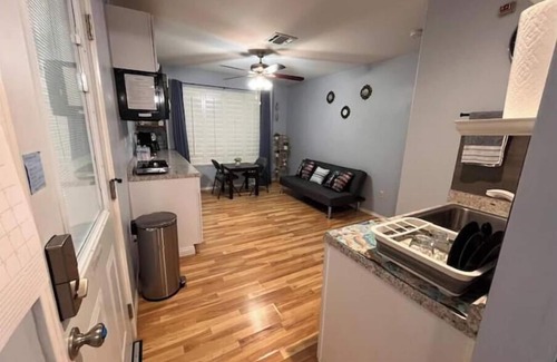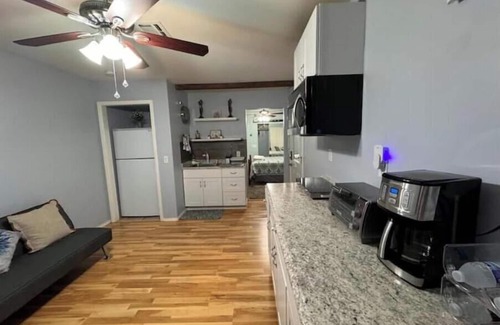 The hardwood Living room has a futon to accommodate extra guest(s). A kitchenette with basic cooking facilities like electric stove, microwave, refrigerator, air fryer, coffee maker with supplies and pans & cutlery along with a dining corner for 2. Kitchenette is equipped with Carbon monoxide alarm and a ceiling fan. Additional Queen mattress & bedding also available to accommodate extra guests.