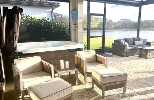 Watch the sunrise over the pond from a reclining loveseat in the master suite or from the private hot tub in the extended lanai. Sip on a drink by the outdoor gas fireplace or enjoy the indoor electric fireplace with friends and family. The guest room has a desk for work, play or getting ready for the day.