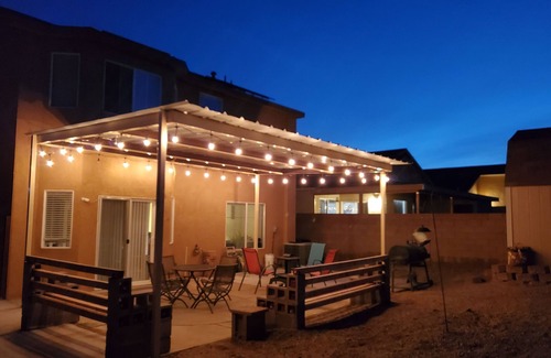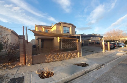 Home is 2200 sq. ft. 4 bedrooms, sleeps 8 people comfortably, with 2 1/2 baths and has a full house water filtration system. Covered parking (NO garage access) and covered backyard patio. Located 10 miles from the ABQ Sunport and Old Town, 8 miles to downtown, 14 miles to Nob Hill and the University of New Mexico and 19 miles to Balloon Fiesta park. Walmart, Walgreens various restaurants, movie theater, and department stores are close within a 3 mile radius.