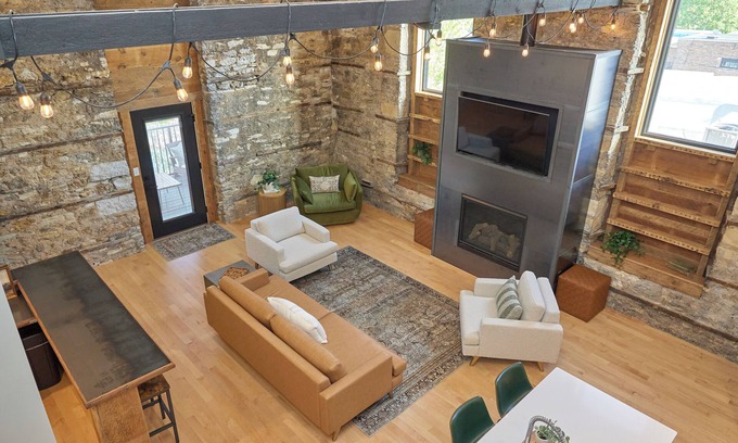 Beautiful condo in downtown Utica. This beautiful condo features exposed stone and an open concept entertaining space including a bar with mini fridge and bar tools. 3 bedrooms and 2.5 bathrooms allow for plenty of comfortable sleeping for your entire group along with a sleeper sofa in the second living area. Master bedroom has a king bed, its own bathroom, and walk in closet. The second bedroom has 2 queen beds and the third has a queen bed and extra twin cot. They share a bathroom with double sinks. Large kitchen with dishwasher, stove, oven and microwave complete with cooking utensils, pots and pans, small appliances, and basic cooking ingredients. Complimentary tea, coffee, and hot chocolate. This unit has its own laundry room with detergent provided as well. Young families are provided with a pack n play, high chair, and children's tableware. Upstairs living room is set up for lounging and playing board games. Back private patio has a gas grill and overlooks a common space where guests of Bruce and Ollies and Ginger Road Brewery often congregate. This condo is conveniently located above Bruce and Ollies, a coffee and ice cream shop in the Bickerman Building. It is steps away from August Hill Winery, downtown shops, nighttime entertainment during the summer months, and a short drive to Starved Rock State Park. It is also a short walk to the I & M Canal. Many people take the afternoon and travel to either Ottawa or Lasalle by bike via the I&M Canal. Come and see what Utica has to offer.