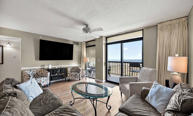 Spacious and Open 3-bedroom 2-bath condo with an ocean view! Braemar Towers is located oceanfront on 131st Street perfectly maintained and close to restaurants shops and activities. Braemar Towers will seem like its own private resort complete with amenities that include an outdoor pool tennis fitness center with saunas game room and a large open air deck ocean front. Please know there is a $75 Registration Fee assessed to each reservation. You will be required to register your vehicle at the Braemar Towers front desk upon arrival.