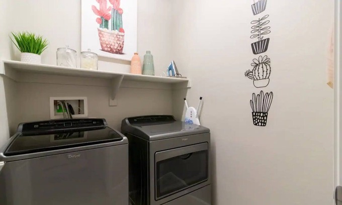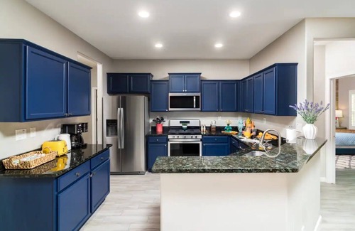 This fabulous colorfully fully furnished 3 bedroom home is equipped with all the comforts of home. Split floor plan with 1 king and 2 queen size rooms. Large patio to entertain with grill, pizza oven and smoker. All brand new appliances, washer dryer and fully stocked kitchen for all your cooking needs. Beautiful quiet neighborhood. Shops and grocery stores near by.