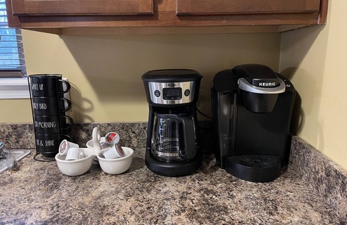 The full kitchen has a large refrigerator/freezer, an electric range with double oven, a dishwasher, a drip coffee maker and Keurig machine, an electric hot-water pot for tea, a toaster, knives and silverware, pots and pans, dishes and glasses.