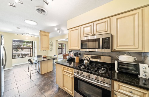 The clean and recently-renovated kitchen has all granite countertops, stainless steel appliances, every modern convenience and is connected to a tasteful dining room by a convenient island bar with stylish stools. This area is perfect for preparing your morning coffee or sumptuous meals for you and yours.