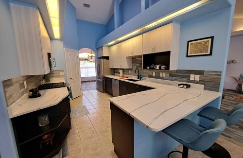6 months minimum stay. Discover the charm of this newly remodeled 4-bedroom, 3-bathroom furnished home in the serene neighborhood of Creekwood. The interior of this thoughtfully designed abode is adorned with a stylish kitchen/dining combo featuring a convenient breakfast bar, walk-in pantry, sleek quartz countertops, and state-of-the-art stainless steel appliances equipped with air fryer functions. The kitchen also boasts a cutting-edge "Wi-Fi Connect" enabled dishwasher and oven, providing advanced technological assistance for your daily routines. Adding to its allure, the kitchen is finished with contemporary soft-close cabinets and drawers. The welcoming living area is graced with a snug gas fireplace, elegant plant ledges, and a soaring vaulted ceiling, creating the perfect ambiance for unwinding after a long day. There is a formal dining area that can be utilized as a music area, office, or bonus area. The well-planned layout ensures privacy, with the spacious master bedroom nestled on the left wing of the house, providing direct access to the screened pool area for a tranquil retreat. The lavish en-suite master bath is complete with a new double vanity, graced with comfort-height quartz countertops, a luxurious jetted tub, a separate shower, and two walk-in closets, supplemented by an additional linen closet for added convenience. Both guest bathrooms include comfort-height vanities with quartz countertops and upgraded mirrors as well. Revel in the seamless elegance of the all-tile flooring and ceiling fans throughout this exquisite home. This nicely furnished home includes, among other things, an extendable dining table, 6 seat sectional sofa with 2 chaises, a swivel chair with an ottoman, a 50-inch smart TV, a home-theatre system and Wii, a digital piano, and high-quality mattresses. The covered lanai beckons entertaining and leisure, offering a gas grill, patio furniture, and pool accessories. The screened-in heated pool is a year-round delight, powered by solar panels, ensuring endless enjoyment. The privatized backyard oasis encompasses a soothing sitting area featuring a charming chiminea for cozy fireside gatherings and a meditation hut for personal moments of tranquility. Upon owner approval, pets are welcomed, subject to a non-refundable pet fee. As a delightful bonus, lawn service, pool service, and Wi-Fi are all included. No smokers, please. Don't let this incredible opportunity slip through your fingers - seize the chance to make this exceptional house your home! Please contact host for info and application procedure.